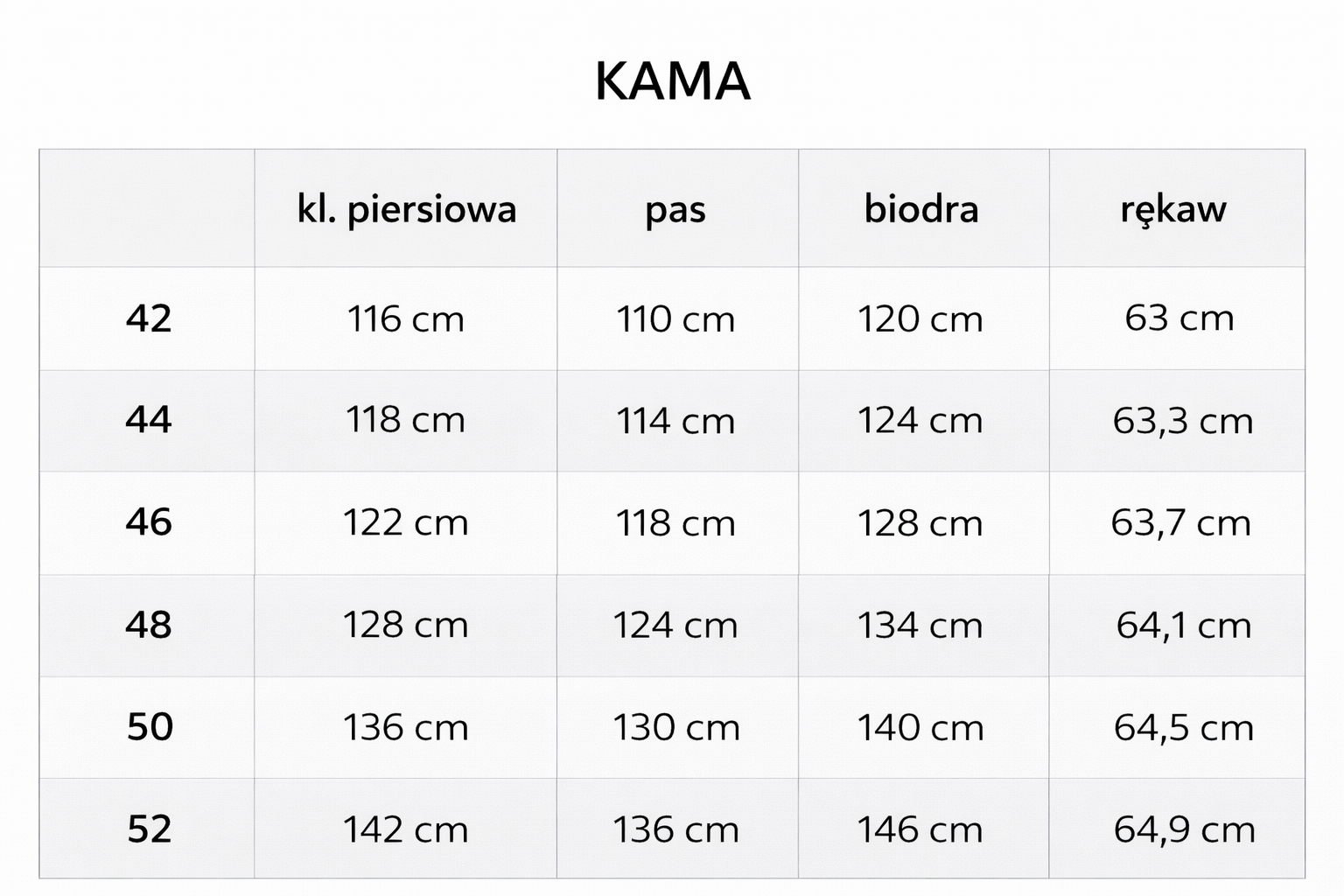 Kama to bardzo ciepła i zgrabna kurtka zimowa. Stójka połączona jest z kapturem tworząc otulający szyję szal. Drukowana podszewka. Pikowania bardzo ładnie profilują sylwetkę. Modelka na zdjęciu nosi rozmiar 42.